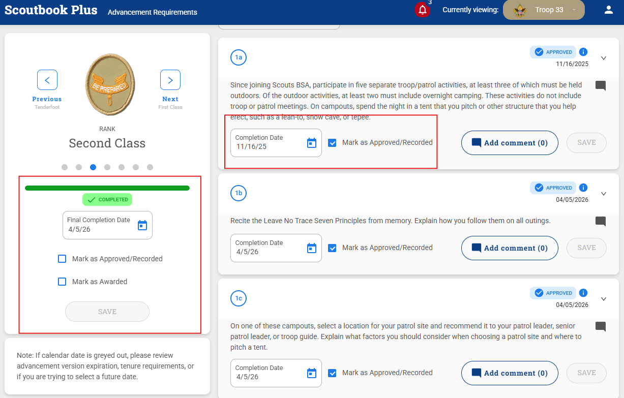 You can also un-approve rank, awards and merit badges at the scout profile page by selecting the item. One in the rank, award or merit badge you would remove the date by hovering over the calendar icon and selecting the X and uncheck the approval check and click save
