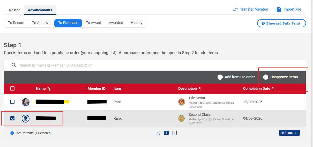 Click on the Scout’s name in the Advancements > To Purchase section in Scoutbook Plus